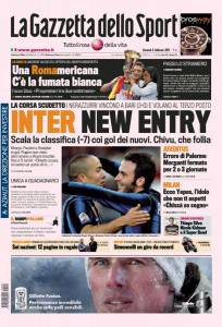 RASSEGNA STAMPA GAZZETTA DELLO SPORT INTER SERIE A BARI- La Gazzetta dello Sport sottolinea, nella sua prima pagina, come i nuovi acquisti dell’Inter abbiamo contribuito alle ultime vittorie. Ieri, nella partita vinta 3 a 0 contro il Bari, ha aperto le marcature Kharja, mentre Pazzini ha raddoppiato. Terzo gol del rientrante Sneijder. I nerazzurri sono adesso a -7 dal Milan.