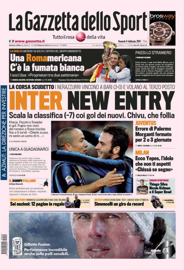 RASSEGNA STAMPA GAZZETTA DELLO SPORT INTER SERIE A BARI- La Gazzetta dello Sport sottolinea, nella sua prima pagina, come i nuovi acquisti dell’Inter abbiamo contribuito alle ultime vittorie. Ieri, nella partita vinta 3 a 0 contro il Bari, ha aperto le marcature Kharja, mentre Pazzini ha raddoppiato. Terzo gol del rientrante Sneijder. I nerazzurri sono adesso a -7 dal Milan.
