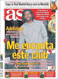 RASSEGNA STAMPA ESTERA AS ADEBAYOR REAL MADRID- Il quotidiano sportivo spagnolo As, dedica la sua apertura alle parole di Emmanuel Adebayor, nuovo acquisto del Real andato subito a segno in Coppa del Re. L’attaccante ha detto di essere felice nella squadra dei Blancos. Un giudizio anche su due compagni: Benzema, a suo parere, ha giocato bene nell’ultima partita, mentre Ozil lo ha positivamente impressionato.