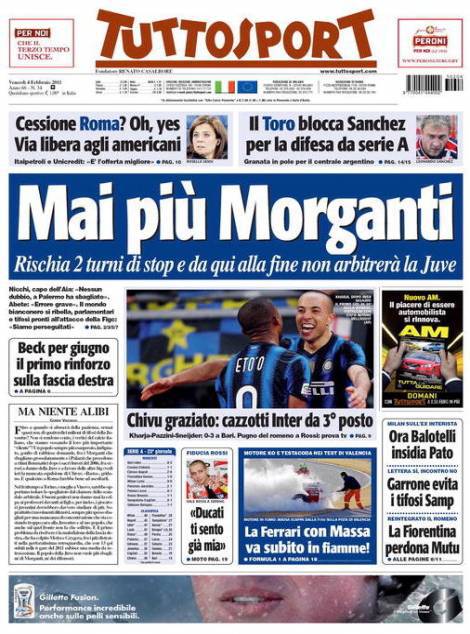 RASSEGNA STAMPA TUTTOSPORT MORGANTI PALERMO JUVENTUS- Tuttosport pubblica nella sua prima pagina le sanzioni dell’arbitro Morganti, protagonista in negativo della sfida Palermo-Juventus vinta 2 a 1 dai rosanero ma fortemente influenzata dagli errori dell’arbitro. Secondo le indiscrezioni del giornale torinese Morganti sarà sospeso per due turni e non arbitrerà la Juve fino al termine della stagione.