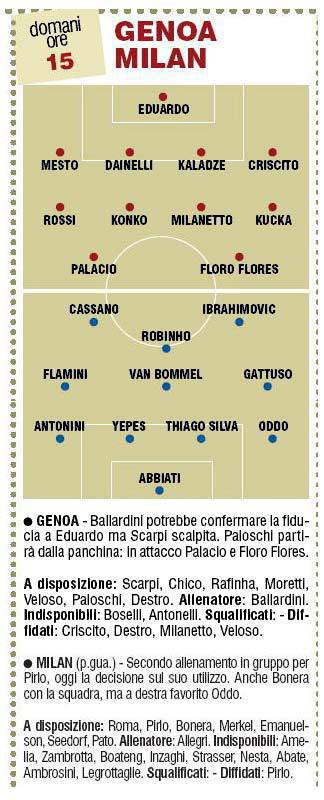 FANTACALCIO GENOA MILAN – Il Milan recupera Van Bommel e schiera il tridente Cassano-Ibrahimovic-Robinho. Ballardini punterà tutto sulla fantasia di Palacio e sulla voglia di rivincita di Kaladze, pronto a fermare Ibra con una marcatura a uomo.