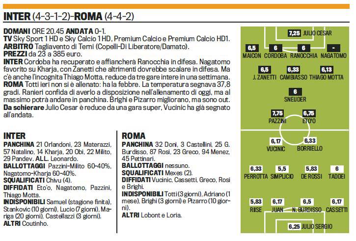 INTER ROMA FORMAZIONI – Ecco le formazioni della Gazzetta dello Sport in foto. In avanti si sfideranno giocatori di livello mondiale: Pazzini-Eto’o da una parte e Vucinic-Borriello dall’altra. Vedremo se starà veramente in panchina Menez, l’uomo in più della Roma di Ranieri.