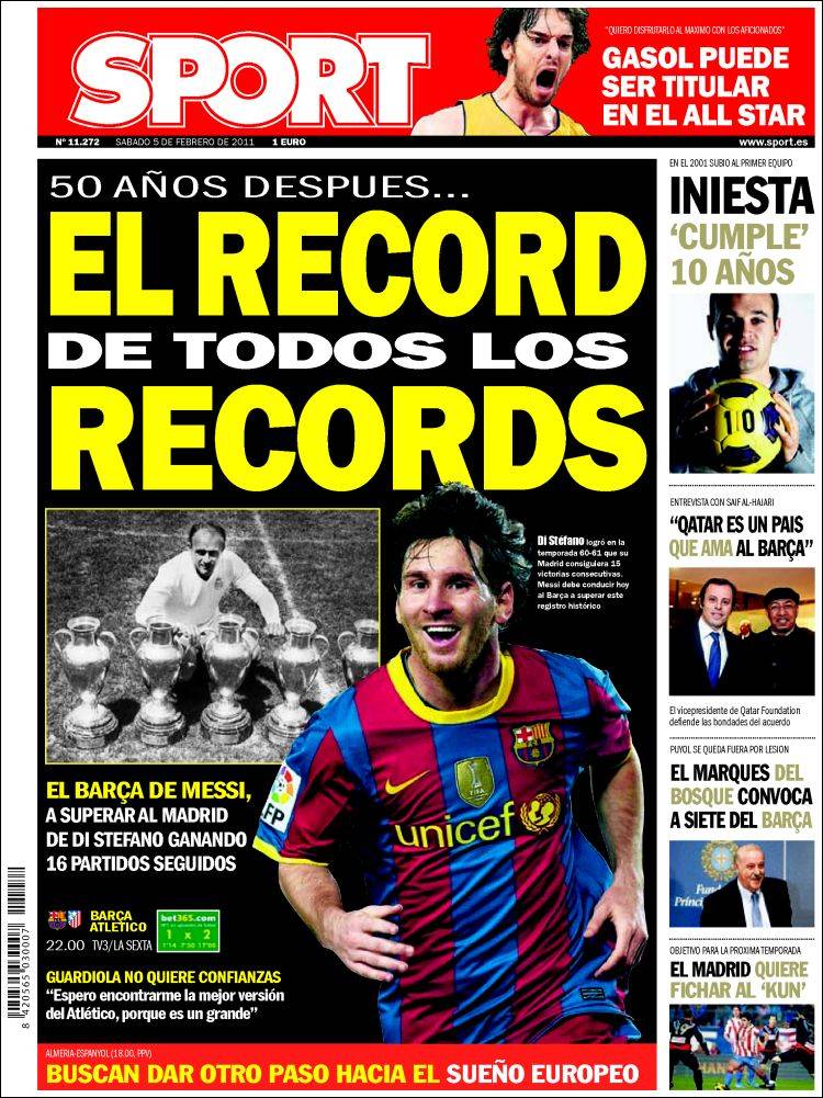 RASSEGNA STAMPA PRIMA PAGINA SPORT- Il quotidiano catalano dedica la prima notizia al Barcellona 2010-2011 una vera e propria squadra da record che sta via via polverizzando tutti i vecchi traguardi raggiunti dalle più vincenti squadre nella storia del calcio spagnolo.
