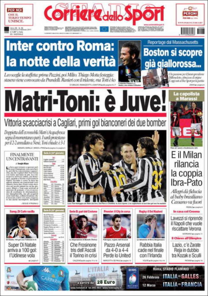 CORRIERE DELLO SPORT MATRI TONI JUVE / La prima pagina del giornale sportivo “Il Corriere dello Sport”, dedica la prima pagina alla nuova coppia gol della Juventus, fresca fresca di gol e di mercato: Matri e Luca Toni si sono resi protagonisti ieri sera, scacciando così un po’ la crisi bianconera.