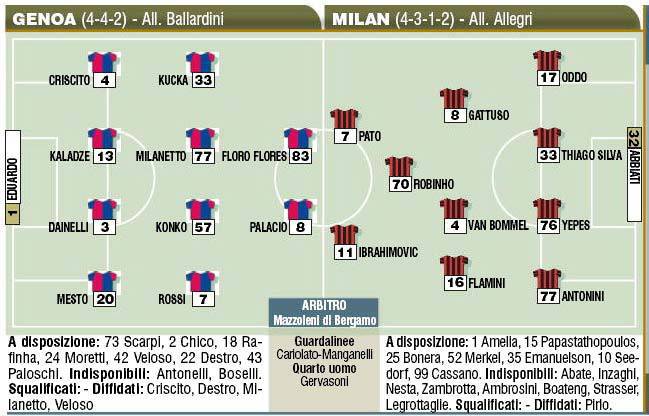 SERIE A FANTACALCIO PROBABILI FORMAZIONI GENOA-MILAN – Match impegnativo per i rossoneri che in trasferta vanno ad affrontare il Genoa di Ballardini, finora non molto convincente sotto il profilo realizzativo ma piuttosto solido. Nel Genoa tra i pali ancora Eduardo nonostante il momentaccio e l’errore che ha consentito alla Fiorentina di sconfiggere i rossoblu, mentre in attacco ci si affida al duo Floro Flores – Palacio. Il Milan invece potrebbe giocare in avanti con Robinho alle spalle di Ibra e Pato, in difesa rientra finalmente nella posizione di centrale Thiago Silva insieme a Yepes e come terzini Oddo e Antonini. La linea mediana dovrebbe essere composta da Gattuso, Flamini e Van Bommel che rientra dalla squalifica per il rosso di Catania. Le formazioni in foto sono tratte dal Corriere dello Sport: