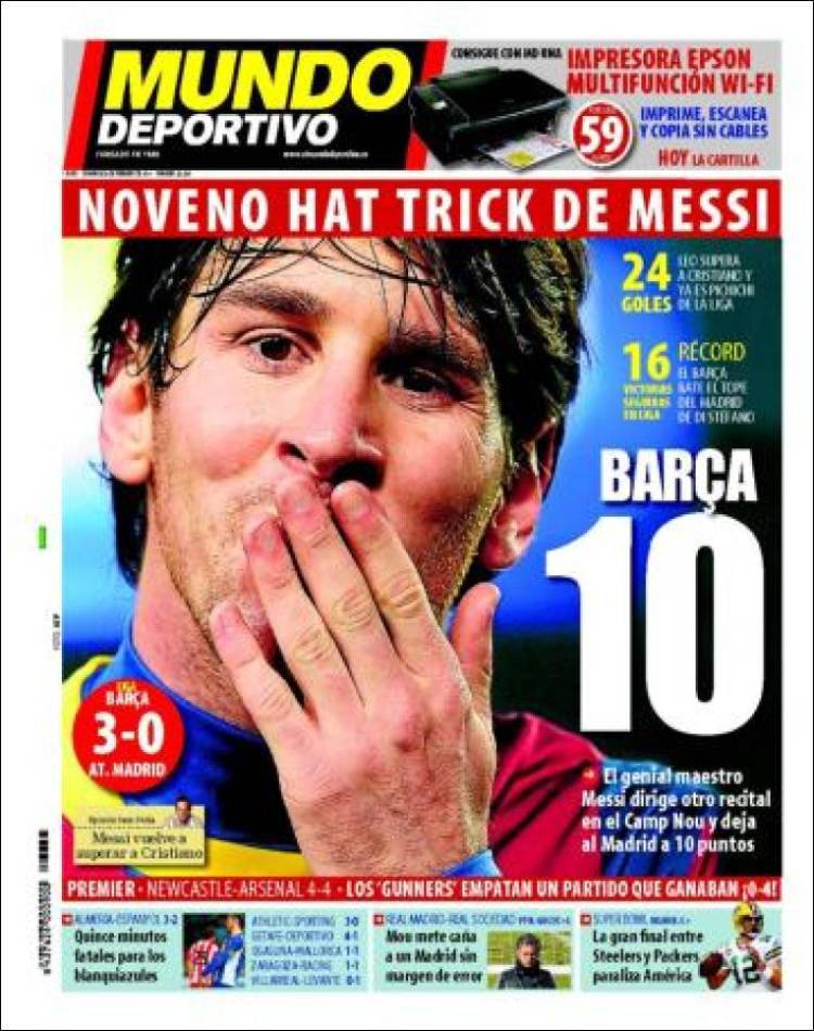 MUNDO DEPORTIVO BARçA / Ancora una volta il fenomeno Lionel Messi si prende tutta la prima pagina del quotidiano Spagnolo El Mundo Deportivo, grazie alla meravigliosa tripletta messa a segno ieri sera nell’impegno contro l’Atletico Madrid.