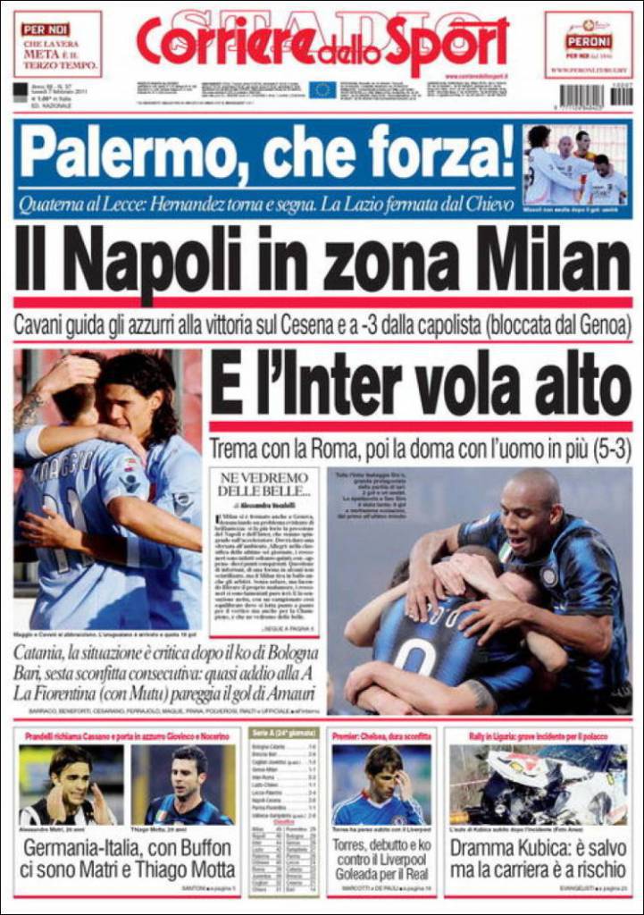 CORRIERE DELLO SPORT NAPOLI MILAN INTER / Corriere dello Sport si concentra sulle vittorie delle due AntiMilan, Napoli e Inter che nella giornata di ieri si sono sbarazzate rispettivamente del Cesena e della Roma. Titolo anche per il Palermo che ritorna a vincere fuori casa contro il Lecce, squadra del cuore del capitano dei rosanero Fabrizio Miccoli.