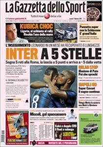 GAZZETTA DELLO SPORT INTER / La prima pagina della Gazzetta dello Sport, si concentra sulla grande prestazione dell’Inter, che con 5 gol ha liquidato la Roma, rimasta in 10 per l’espulsione di Burdisso. Adesso l’Inter è a meno 5 dal Milan, ma con una partita da recuperare.
