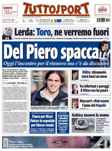 TUTTOSPORT DEL PIERO / Alex Del Piero, ed il suo rinnovo, si prendono la prima pagina di Tuttosport. Sarà oggi infatti l’incontro tra l’entourage del Capitano e la dirigenza bianconera per il tanto sospirato rinnovo. Si punta a a trovareun accordo sulla base di un rinnovo peri un’altra stagione così da far esordire la bandiera della Juventus già nel nuovo stadio.
