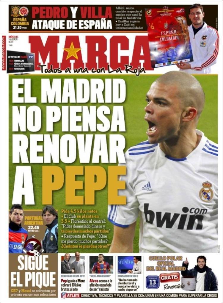 REAL MADRID PEPE RINNOVO – Sul quotidiano spagnolo Marca si parla del contratto in scadenza a giugno 2012 di Pepe, difensore portoghese pupillo di Mourinho. Il Real Madrid infatti non sarebbe intenzionato a prolungare l’accordo con il lusitano.