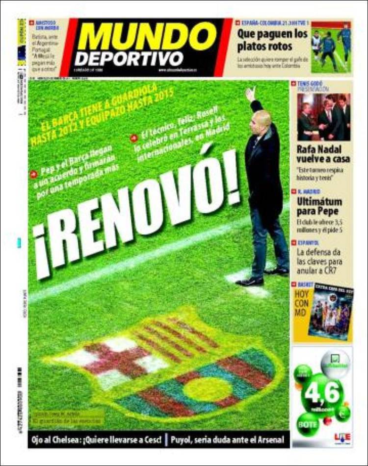 MUNDO DEPORTIVO RINNOVO GUARDIOLA – Sul quotidiano catalano Mundo Deportivo si parla invece del rinnovo di Pep Guardiola con il Barcellona. Il tecnico catalano ha firmato per un altro anno.
