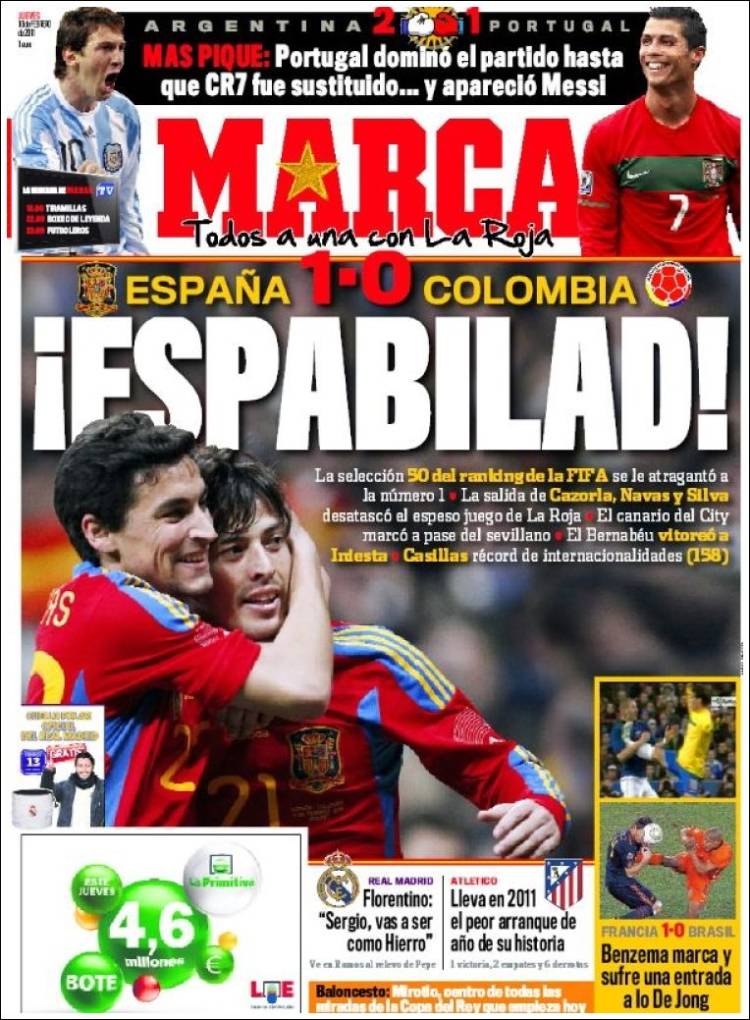 RASSEGNA STAMPA ESTERA MARCA SPAGNA COLOMBIA- Il quotidiano sportivo spagno Marca dedica la propria prima pagina alle amichevoli internazionali di ieri, con largo spazio alla vittoria della Spagna sulla Colombia, vinta uno a zero con gol di David Silva.