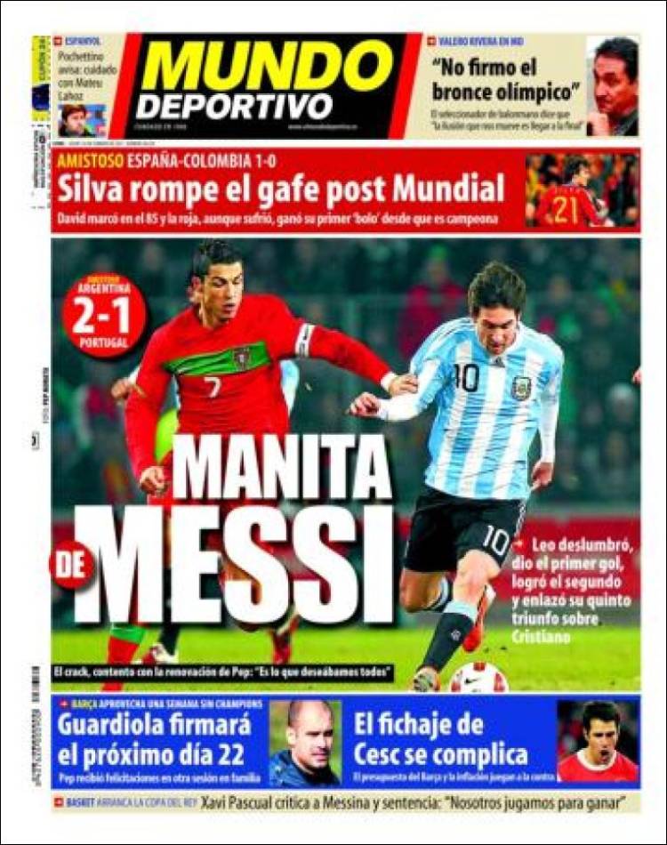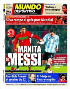 RESSAGNA STAMPA ESTERA MUNDO DEPORTIVO MANITA DI MESSI ARGENTINA PORTOGALLO CRISTIANO RONALDO- Il giornale catalano Mundo Deportivo porta in prima pagina la notizia della vittoria dell’Argentina sul Portogallo per 2 a 1, nel match amichevole di ieri. Il giornale sottolinea la prestazione di Messi, impreziosita da un assist e un gol e ricorda come questa sia la quinta vittoria dell’argentino sul rivale Cristiano Ronaldo.
