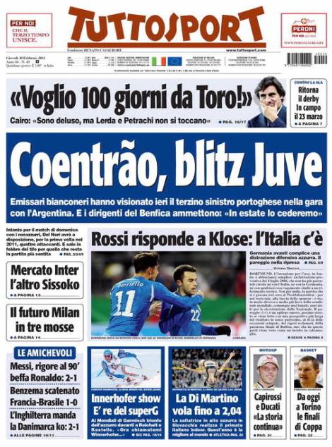 RASSEGNA STAMPA TUTTOSPORT FABIO COENTRAO BENFICA JUVENTUS- Il quotidiano sportivo torinese Tuttosport dedica la sua prima pagina al calciomercato, affermando che alcuni emissari della Juventus avrebbero seguito l’incontro amichevole tra Portogallo e Argentina per valutare il terzino sinistro portoghese Fabio Coentrao.