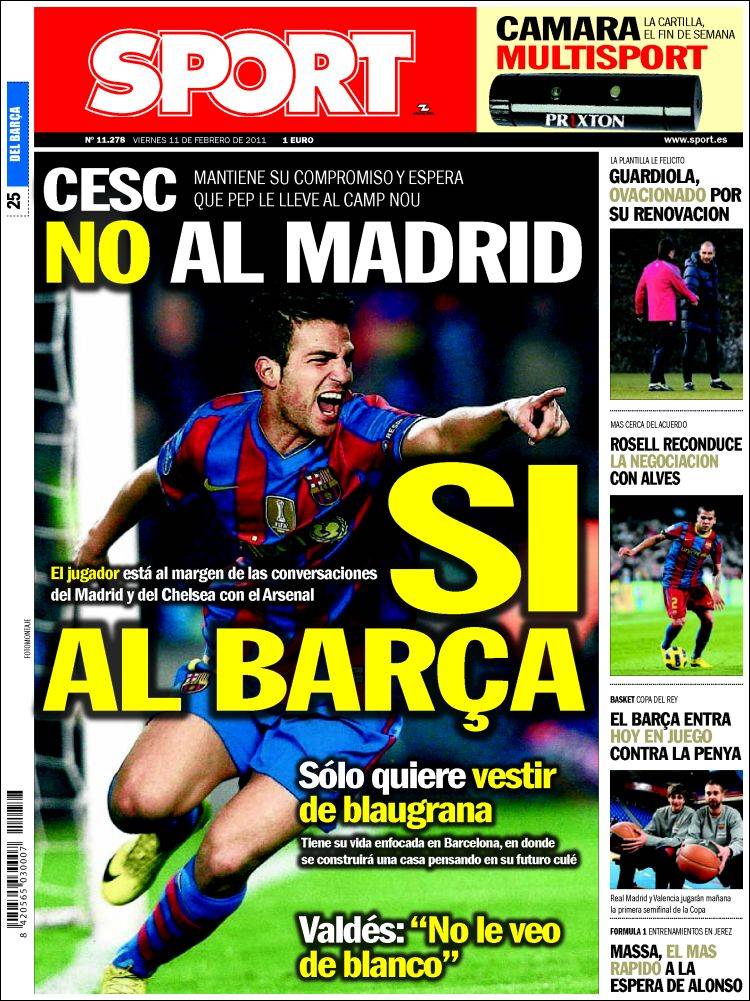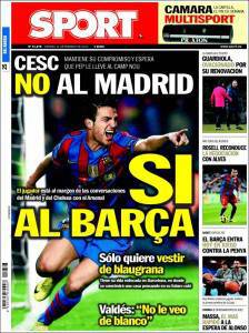 RASSEGNA STAMPA ESTERA SPORT FABREGAS BARCELLONA REAL MADRID ARSENAL- Sport apre il numero di oggi con la notizia che Cesc Fabregas, obietto del Barcellona dalla scorsa estate, avrebbe rifiutato un passaggio al Real Madrid o al Chelsea, squadra che stanno parlando di un suo possibile trasferimento con l’Arsenal, per accasarsi al club blaugrana.