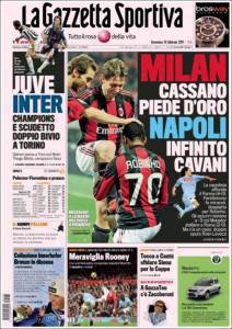GAZZETTA DELLO SPORT MILAN CASSANO NAPOLI CAVANI / Prima pagina della Gazzetta dello Sport totalmente dedicata ai due protagonisti degli anticipi del campionato di Serie A: Antonio Cassano, autore di una rete e 2 assist nel 4-0 rifilato al Parma ed Edinson Cavani che con una doppietta all’Olimpico ha regalato 3 punti al suo Napoli, vittorioso contro la Roma.