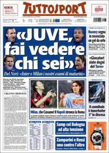 TUTTOSPORT JUVE / La prima pagina del quotidiano sportivo Torinese TuttoSport, si concentra sul Derby d’Italia di questa sera. Juventus-Inter infatti si disputerà alle 20.45 allo Stadio Olimpico di Torino. Gigi Delneri, allenatore dei bianconeri, ha caricato i suoi chiedendo di mostrare il vero carattere della sua Juve.