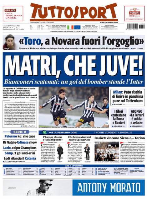 TUTTOSPORT MATRI JUVENTUS – Su Tuttosport grandi elogi per la Juventus che batte l’Inter uno a zero con il gol di Matri. Per l’Inter traversa di Eto’o nel finale.