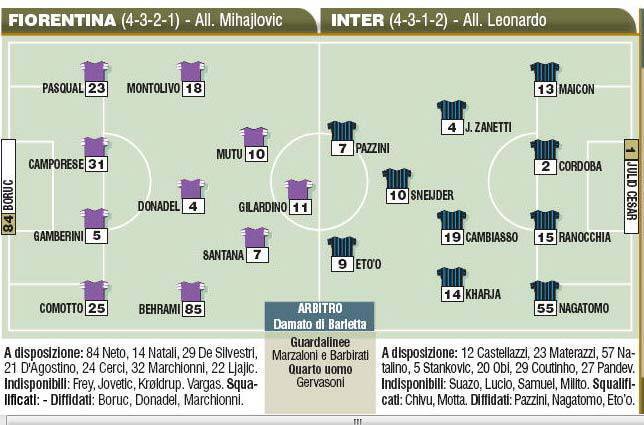 FANTACALCIO FIORENTINA INTER FORMAZIONI – Inter e Fiorentina saranno impegnate nel recupero di serie A, una gara che potrebbe consentire ai nerazzurri di riprendere l’avvicinamento al Milan dopo il ko contro la Juve. Ecco i 22 in campo secondo il Corriere dello Sport.