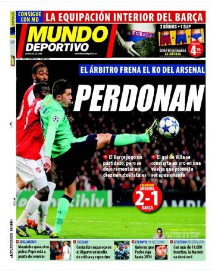 RASSEGNA STAMPA ESTERA MUNDO DEPORTIVO ARSENAL BARCELLONA ARBITRO VILLA- Il giornale catalano Mundo Deportivo afferma, nella sua prima pagina, che l’arbitro della sfida di Champions League giocata ieri dal Barcellona in casa dell’Arsenal avrebbe fermato il ko degli inglesi ma sarebbe stato perdonato dalla squadra spagnola. Il giornale giudica positivamente la prova degli uomini di Guardiola, che però si sono fatti rimontare in dieci minuti.