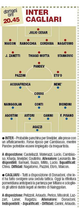 FANTACALCIO INTER CAGLIARI PROBABILI FORMAZIONI – Domani sera anticipo serale della 26esima giornata tra Inter e Cagliari. Leonardo conferma la formazione che ha battuto la Fiorentina. Le formazioni del Corriere dello Sport.