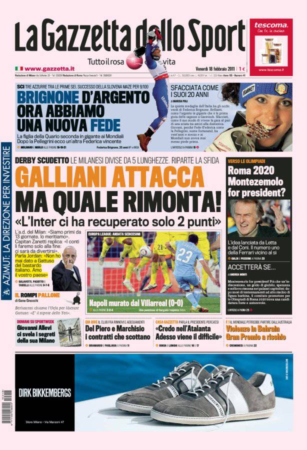 RASSEGNA STAMPA GAZZETTA DELLO SPORT GALLIANI ZANETTI JORDAN DICHIARAZIONI- La Gazzetta dello Sport oggi dedica la prima pagina alle dichiarazioni dell’amministratore delegato del Milan Adriano Galliani che ha sottolineato che, escludendo i due recuperi, l’Inter ha recuperato sul Milan solo due punti. Nella pagina anche la risposta di Zanetti e le dichiarazioni di Joe Jordan riguardo le provocazioni a Gattuso.