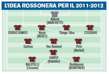 CALCIOMERCATO MILAN BALOTELLI GANSO – Una vera e propria squadra dei sogni. Adriano Galliani comincia a gettare le basi per un Milan stellare. A giugno potrebbero esserci alcuni clamorosi addii che verranno colmati da arrivi importanti. Pato dovrebbe salutare la compagnia, su di lui ci sono Barcellona e Real Madrid. Al suo posto potrebbe arrivare Mario Balotelli dal Manchester City. In difesa c’è sempre l’incognita Nesta, in caso di addio pronto Mexes con Sergio Ramos e Cissokho sulle fasce. Dietro le punte si cercherà di vincere il derby con l’Inter per Ganso del Santos. Ecco la foto del Corriere dello Sport.