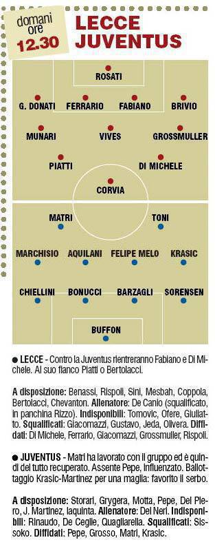 FANTACALCIO LECCE JUVENTUS FORMAZIONI – Domani alle 12.30 allo stadio Via del Mare di Lecce la Juventus affronterà i padroni di casa. Delneri è intenzionato a schierare la stessa formazione che ha battuto l’Inter domenica scorsa. Le formazioni del Corriere dello Sport.