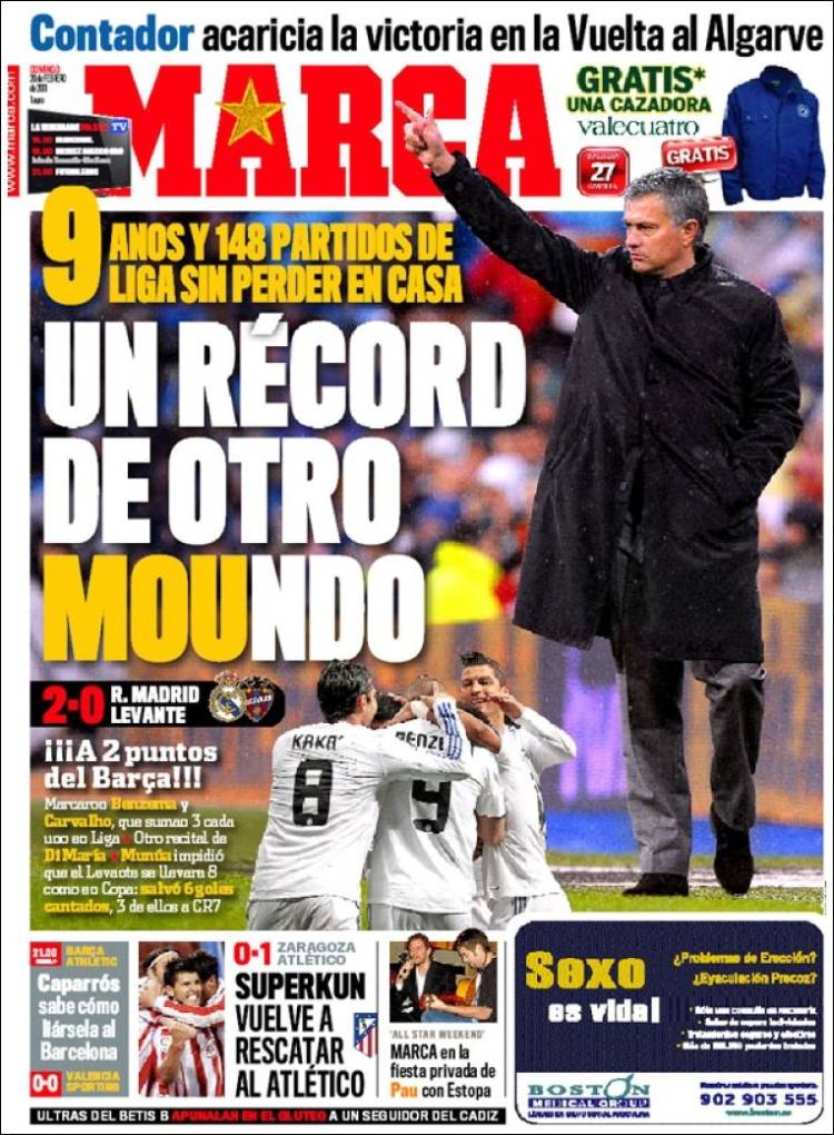 MARCA MOURINHO /Marca, quotidiano sportivo vicino al Real Madrid, apre quest’oggi la sua edizione con una foto notizia dedicata al suao allenatore Josè Mourinho, che oggi ha battuto ancora un record: l’allenatore portoghese infatti non perde da 9 anni in casa, per intenderci da quando allenava il Porto.