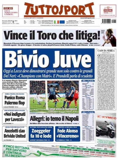TUTTOSPORT BIVIO JUVE / Il quotidiano sportivo di Torino, Tuttosport, apre l’edizione di oggi con un titolo dedicato alla Juventus. I bianconera si trovano davanti un bivio quest’oggi, chiamati a replicare contro il Lecce la bella vittoria contro l’Inter.