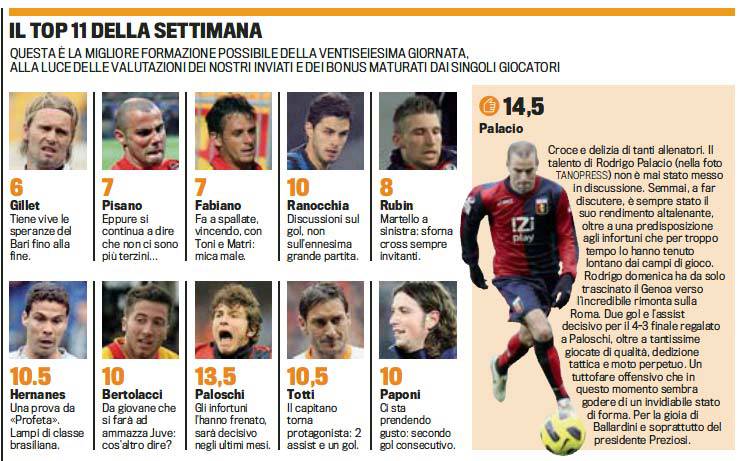 FANTACALCIO TOP 11 GAZZETTA FOTO – Di seguito trovate la top 11 della Gazzetta dello Sport, relativa alla ventiseiesima giornata di Serie A. Migliore in assoluto del weekend calcistico l’attaccante del Genoa Palacio, che grazie ad una doppietta e ad un assist ottiene un bel 14,5. Bene anche il compagno di squadra e di reparto Paloschi, fermo a 13,5, così come i due capitolini Totti ed Hernanes, a quota 10.5. In porta c’è invece Gillet, che conquista un bel 6 nonostante la rete subita.