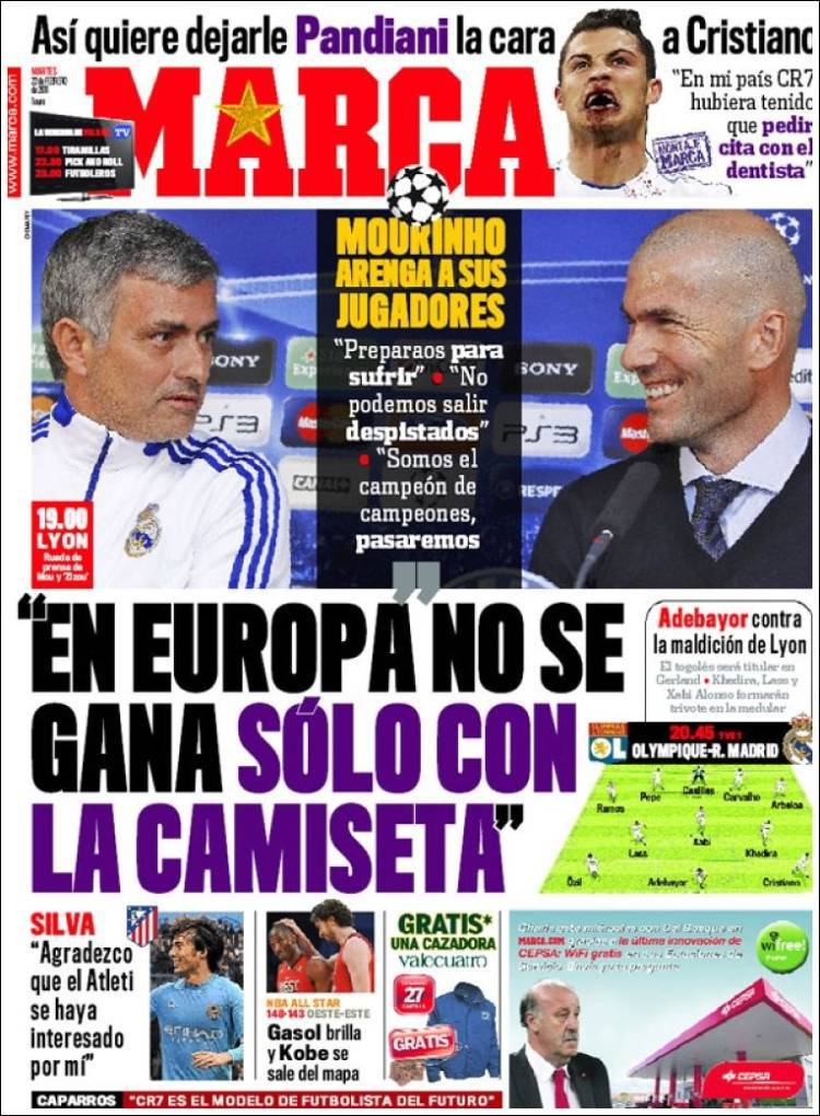 MARCA MOURINHO – Questa sera andata degli ottavi di finale di Champions League per il Real Madrid che farà visita al Lione, vera bestia nera. Mourinho carica i suoi giocatori.