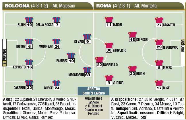 BOLOGNA ROMA PROBABILI FORMAZIONI SERIE A – Questa sera Bologna-Roma recupereranno il match del 30 gennaio interrotto per la fitta nevicata. Si riparte dal 17esimo minuto con il corner a favore del Bologna, debutto sulla panchina della Roma di Montella. Queste le probabili formazioni secondo il Corriere dello Sport.