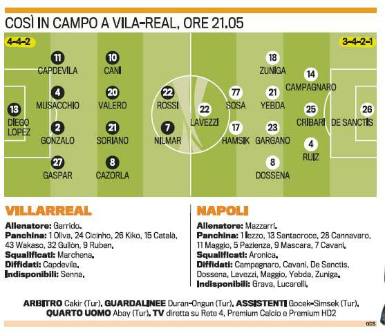 EUROPA LEAGUE VILLAREAL-NAPOLI PROBABILI FORMAZIONI / Cavani out. Nel match di questa sera, nel quale i partenopei tenteranno la conquista degli ottavi di Europa League, assente di lusso il matador Cavani, che partirà dalla panchina. Unica punta, con il supporto di Aronica e Hamsik, sarà il pocho Lavezzi, chiamato in compito ad insidiare la porta di Diego Lopez. Per il sottomarino giallo coppia offensiva composta dal duo tutto goal Rossi e Nilmar. Di seguito la foto con gli schieramenti di Napoli e Villareal secondo quanto riportato da La Gazzetta dello Sport.