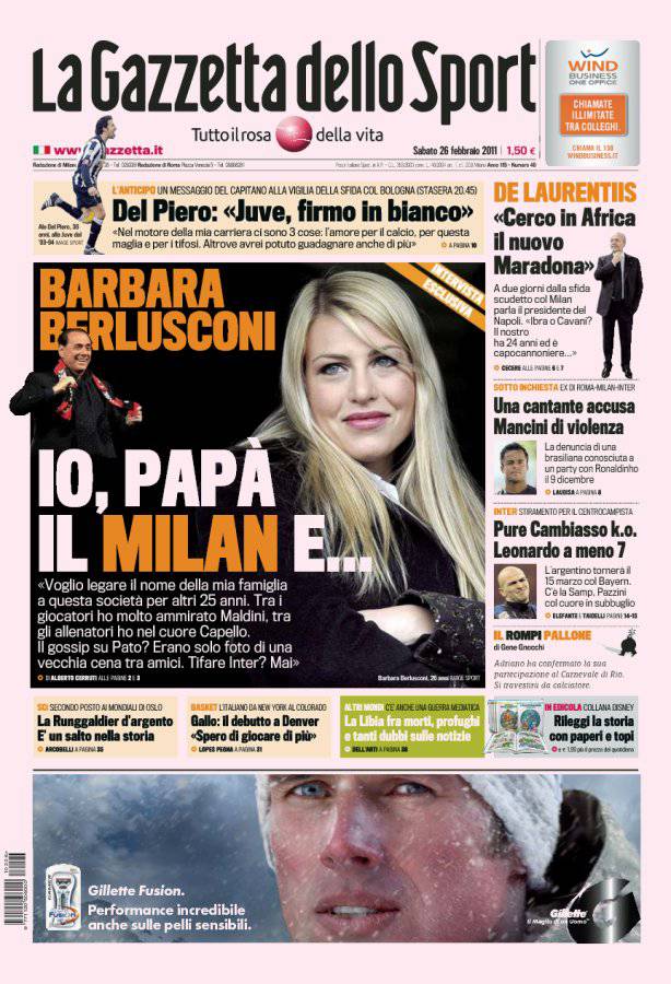 RASSEGNA STAMPA GAZZETTA DELLO SPORT BARBARA BERLUSCONI INTERVISTA PATO- La prima pagina dalla Gazzetta dello Sport di oggi è dedicata ad un’intervista esclusiva a Barbara Berlusconi, figlia del presidente del Milan, che ha parlato del futuro della società e delle voci di una presunta love story tra lei e Pato.