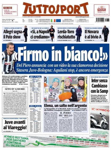 RASSEGNA STAMPA PRIMA PAGINA TUTTOSPORT DEL PIERO RINNOVO DICHIARAZIONI- Il quotidiano sportivo Tuttosport dedica oggi la prima pagina alle dichiarazioni di Del Piero in merito al suo rinnovo, del quale sta discutendo in questi giorni con la Juventus. Il capitano bianconero ha dichiarato di essere pronto a firmare in bianco.
