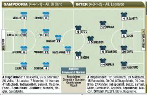 SERIE A SAMPDORIA INTER PROBABILI FORMAZIONI – Sfida dal sapore di amarcord per Giampaolo Pazzini: la partita di stasera con la sua grande ex, la Sampdoria, sarà fondamentale per l’Inter per accorciare le distanze da almeno una tra Milan e Napoli. La Sampdoria è in un momento difficile, dopo l’addio dei due nuovi “gemelli del gol”; Di Carlo è stato criticato (spesso ingiustamente) e i nuovi innesti non hanno ancora trovato la giusta alchimia con il resto della squadra. Non è solo Pazzini l’ex di turno: Biabiany ha appena seguito il percorso inverso, passando ai blucerchiati. Ecco le probabili formazioni in foto del Corriere dello Sport:
