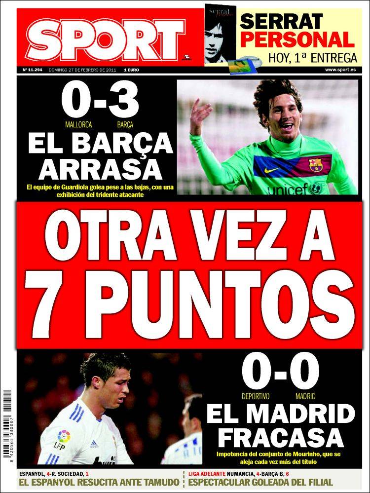 SPORT 7 PUNTI / Sport, quotidiano spagnolo sportivo, dedica la sua prima pagina al doppio impegno di Barcellona e Real Madrid, che permette agli azulgrana di allungare a più 7 sul Real di Josè Mourinho.