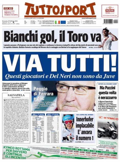 TUTTOSPORT VIA TUTTI / L’edizione odierna del quotidiano Torinese Tuttosport, critica fortemente tecnico e giocatori della Juventus dopo l’ennesima sconfitta di ieri sera, in casa contro il Bologna.