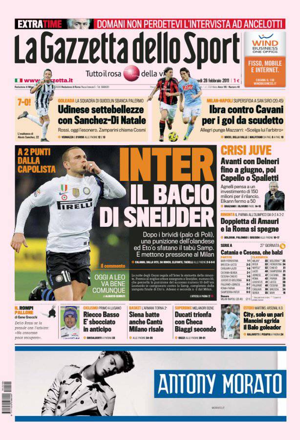 GAZZETTA INTER SNEJDER – Sulla Gazzetta dello Sport si parla della vittoria dell’Inter sul campo della Sampdoria per due a zero.
