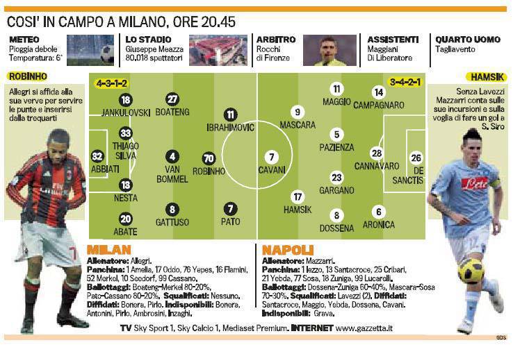 MILAN-NAPOLI PROBABILI FORMAZIONI NOVITA’ – Mancano ormai poche ore al posticipo della 27a giornata di Serie A che vedrà di fronte Milan e Napoli in uno scontro al vertice che potrebbe decretare l’ascesa del Napoli, l’allungo del Milan oppure il prepotente ritorno dell’Inter. In casa Milan pare essere finalmente il turno di Pato da titolare: il Papero affiancherà Ibrahimovic con alle spalle Robinho nel ruolo di trequartista. Sulla fascia sinistra il Milan dovrebbe affidarsi a Jankulovski, mentre sulla destra ci sarà Abate. Il Napoli invece schiererà il consueto 3-4-2-1, con Mascara al posto dello squalificato Lavezzi ed Hamsik a supportare il Matador Cavani, che vorrà sicuramente riprendersi il trono di capocannoniere strappato ieri da Di Natale con la tripletta rifilata al Palermo. Ecco le probabili formazioni della Gazzetta dello Sport in foto: