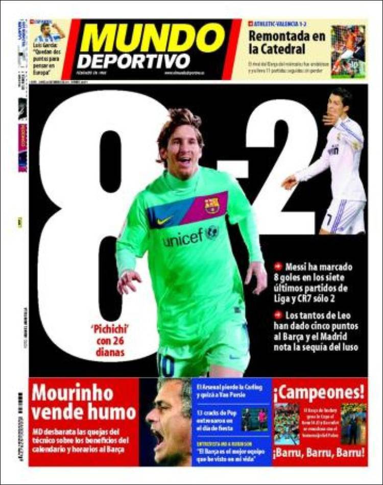 MUNDO DEPORTIVO MESSI RONALDO – Sul quotidiano catalano Mundo Deportivo si parla del confronto tra Messi e Cristiano Ronaldo con l’argentino che ha segnato 8 gol nelle ultime sette giornate contro le due reti di Ronaldo.