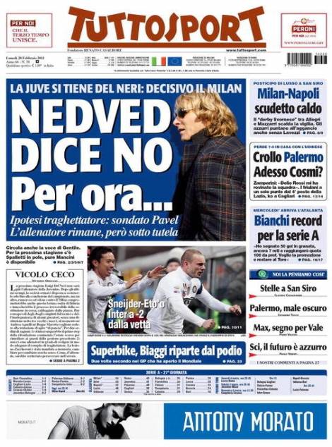 TUTTOSPORT NEDVED – Su Tuttosport si parla della crisi Juventus con l’ipotesi traghettatore al posto di Delneri. Si parla di Nedved ma il ceco ha per ora rifiutato.