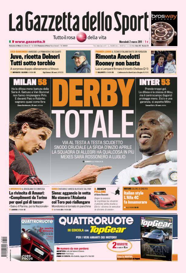 GAZZETTA MILAN INTER – Sulla Gazzetta dello Sport si parla del derby tra Milan e Inter, attuale prima e seconda forza del campionato.