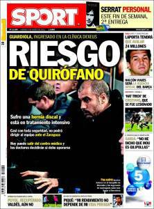 RASSEGNA STAMPA ESTERA SPORT GUARDIOLA QUIROFANO RISCHIO RICOVERATO- Anche il giornale spagnolo Sport dedica la sua prima pagina alla delicata situazione di Guardiola, ricoverato all’ospedale. Secondo Sport c’è il rischio che si debba ricorrere al quirofano, ossia ad una struttura indipendente che effettua operazioni chirurgiche.