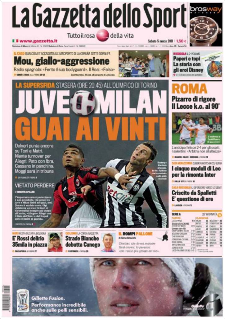 RASSEGNA STAMPA GAZZETTA DELLO SPORT PRIMA PAGINA JUVENTUS-MILAN – La Gazzetta dello Sport dedica la prima notizia al big match di questa sera Juventus-Milan che potrebbe costare caro a chi perde.