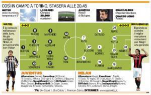 JUVENTUS MILAN PROBABILI FORMAZIONI FOTO – Qui di seguito trovate le probabili formazioni della gara tra Juventus e Milan in programma stasera all’Olimpico di Torino. La Juventus manda Del Piero in panchina confermando il duo Matri-Toni in attacco. Per il Milan rebus in attacco, l’unico sicuro del posto è Ibrahimovic. Boateng potrebbe partire dall’inizio con Pato davanti ma anche Robinho e Cassano hanno buone chance di partire dal primo minuto. Le formazioni di Juventus – Milan sono a cura de La Gazzetta dello Sport.