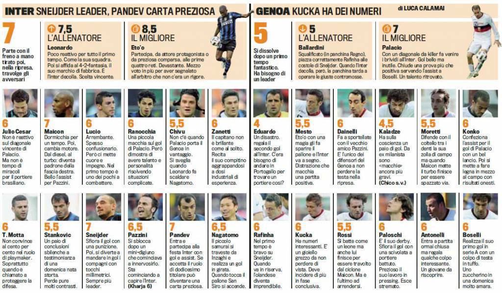 INTER GENOA FANTACALCIO GAZZETTA – L’Inter travolge il Genoa cinque a due con una doppietta di un fantastico Eto’o. Ecco i voti e le pagelle della Gazzetta dello Sport.