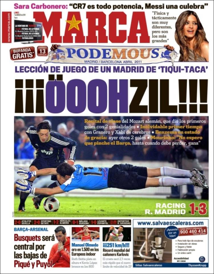 MARCA REAL MADRID OZIL – Il quotidiano spagnolo Marca parla della vittoria per tre a uno del Real Madrid sul campo del Racing con due gol di Benzema e uno di Adebayor. Grande prova di Ozil.