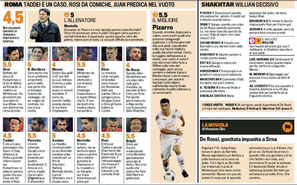 FANTACALCIO SHAKHTAR DONETSK ROMA CHAMPIONS LEAGUE PAGELLE VOTI – Nella serata terribile che vede la Roma uscire dall’Europa, secondo la Gazzetta dello Sport, si salva solo Pizarro. Neppure il cileno arriva comunque al 6, i gialorossi affondano sotto i colpi dello Shakhtar e dicono addio alla Champions League.